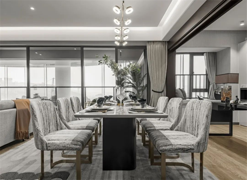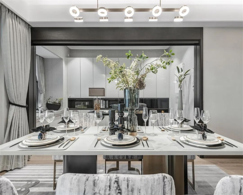 餐廳延續了客廳的風格,餐邊柜將定制柜的美觀與實用性發揮得淋漓盡致。現代感十足的燈具將溫暖的光線投射到大理石餐桌和布藝餐椅上,營造出舒適的用餐氛圍。