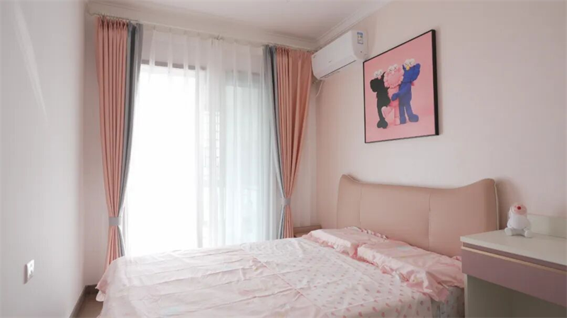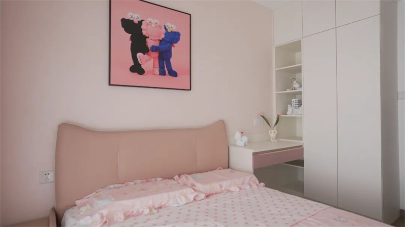 兒童房以柔和的粉色為主調,營造溫馨可愛的氛圍。床頭軟包與床品呼應,搭配卡通圖案,充滿童趣。墻上掛有時尚藝術畫作,增添個性與趣味。右側定制衣柜與書桌一體設計,收納與學習功能兼備,簡潔實用。窗簾采用粉灰拼色,透光柔和,整體空間既夢幻又不失現代感,是孩子成長的理想小天地。