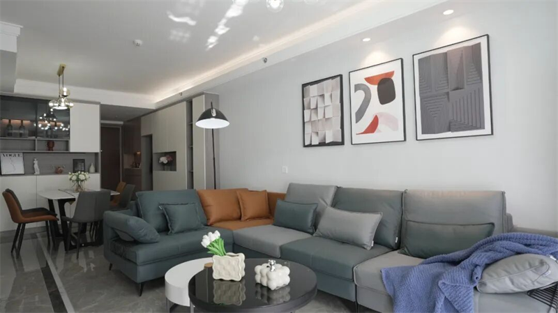客廳L型布藝沙發選用藍灰與橙色拼接配色,既提升視覺活力,又帶來柔軟舒適的坐感體驗。中央圓形茶幾組合簡潔實用,黑白搭配呼應整體色調。墻上三幅抽象藝術掛畫點綴墻面,增添藝術氣息。一盞黑色弧形落地燈不僅提供局部照明,更成為空間中的點睛之筆。