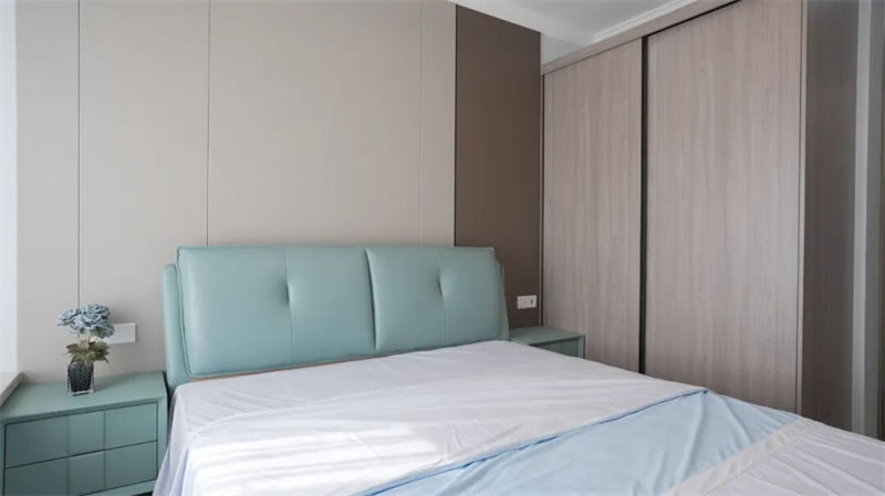 主臥以柔和色調營造寧靜舒適的睡眠空間,淺灰與木色背景墻搭配湖綠色軟包床頭,清新雅致。同色系床頭柜與衣柜設計協調統一,簡潔實用。大窗配淺色紗簾與波浪邊窗簾,采光充足又不失溫馨。整體布局清爽有序,讓臥室成為放松身心的理想休憩之所。