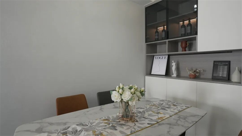 餐廳以現代簡約風格打造,淺灰色墻面與大理石餐桌相得益彰,搭配不同色調的皮質餐椅,簡潔又富有層次。餐邊柜采用玻璃門與開放格設計,內置燈帶,兼具收納與展示功能。一束鮮花點綴桌面,增添生活氣息。空間與客廳自然連通,動線流暢,營造出溫馨舒適的用餐氛