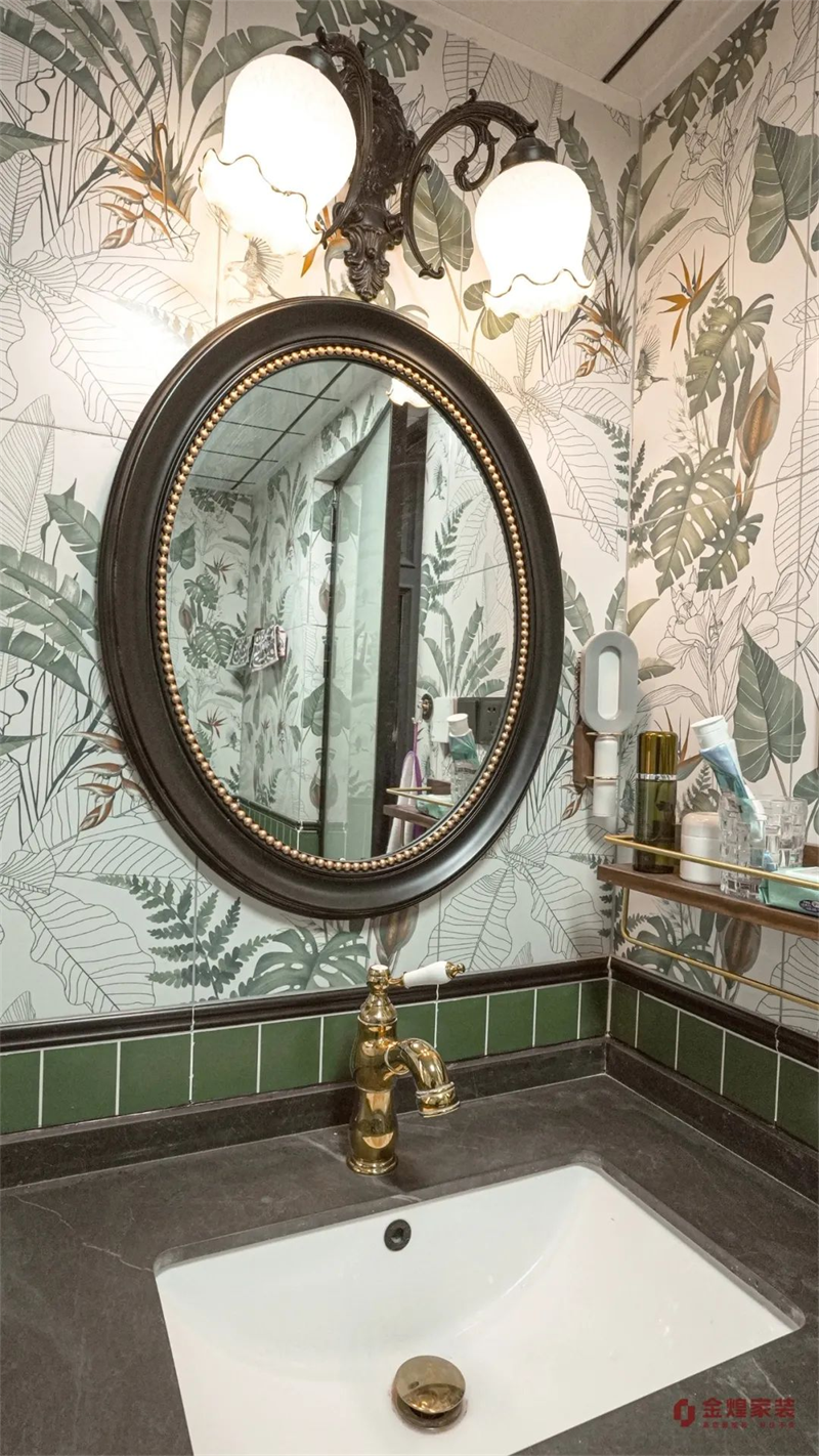 為提高空間利用率,衛生間做了干濕分離設計。洗手臺墻面為大面積藝術壁畫,在鏡面燈的襯托下看起來格外溫馨,使空間更加優雅復古。