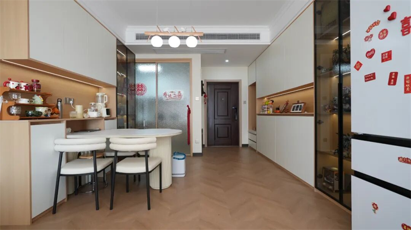 原木奶油風的基調延續至餐廚區域,開放式餐邊柜設計巧妙融合收納與展示功能,暖光燈帶點亮每一處細節,讓日常用品也擁有詩意的陳列。圓潤的白色餐桌搭配柔軟坐墊椅,營造輕松圍坐的溫馨氛圍;一旁冰箱貼滿喜慶紅標與可愛貼紙,洋溢著新居的喜悅與煙火氣。